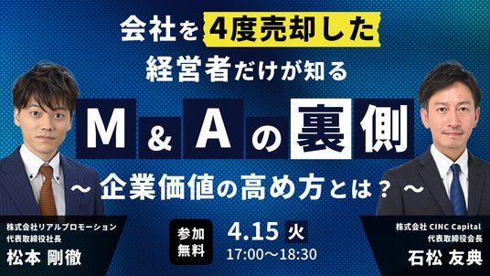 株式会社CINC(本社:東京都港区、代表取締役:石松友典、以下CINC)の子会社である株式会社CINC Capital(所在地:東京都港区、取締役 執行役員社長:阿部泰士、以下CINC Capital)が、経営者向けセミナー『会社を4度売却した経営者だけが知るM&Aの裏側 ~企業価値の高め方とは?~」を開催いたします。