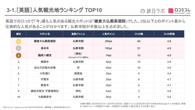 英語での口コミで「今」最も人気のある観光スポットは「鎌倉大仏殿高徳院」でした。仏教寺院が半数以上を占めており、鎌倉の歴史への興味・関心がうかがえます。