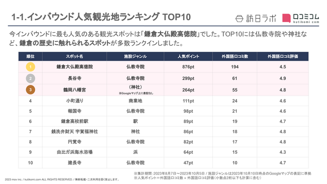 TOP10には景勝地や博物館など、鎌倉の自然・歴史に触れられるスポットが多数ランクインしました。