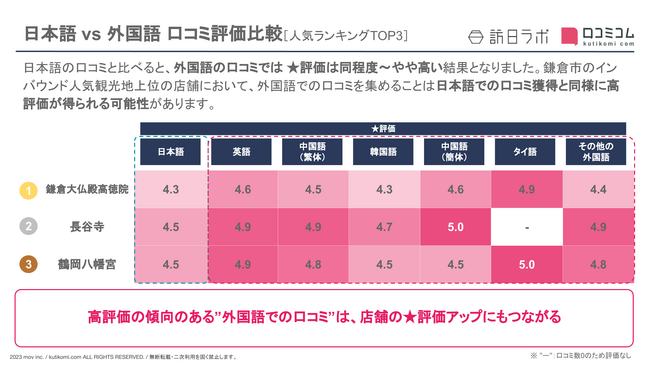 日本語の口コミと比べると、外国語での口コミでは、★評価は同程度~やや高い結果となりました。鎌倉市のインバウンド人気観光地上位の店舗において、外国語での口コミを集めることは日本語での口コミ獲得と同様に高評価が得られる可能性があります。