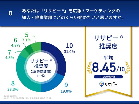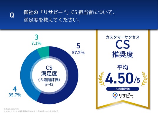 CS)満足度調査では、5段階中、「4.50」という非常に高い評価をいただきました。その内訳としては、全てのお客様が5段階評価で「3」以上、かつ57.1%のお客様が5段階中「5」を回答。さらに知人・他事業部への「リサピー(R)︎」サービス推奨度では、10段階中平均「8.45」という結果となりました。