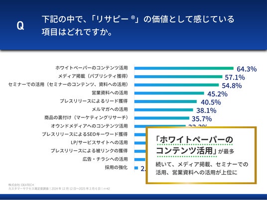 このたびのCS満足度調査では、多くのお客様が特に「ホワイトペーパーのコンテンツ活用」や「メディア掲載(パブリシティ獲得)」、「セミナーでの活用(セミナーのコンテンツ、資料への活用)」といった項目において、「リサピー(R)︎」サービスの価値をご実感いただいていることがわかりました。今回の結果を励みに、さらにお客様に寄り添ったサービスに磨きをかけ、顧客の成功に貢献してまいります。