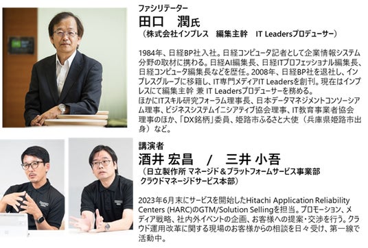 本セミナーは、SRE観点の継続的な運用改善を通じて、クラウド運用の変革を伴走型で支援する「Hitachi Application Reliability Centers (HARC)」を適用し、「運用負荷の増大」や「ランニングコストの増加」、「人財獲得の高いハードル」といった現場の課題を解決する手法について、具体的なユースケースを交えてご説明します。また、ITジャーナリストの田口潤氏がファシリテーターとなり、随時鋭い視点に立った質問を投げかけ、日立の考えるクラウド運用改革を明らかにしていきます。