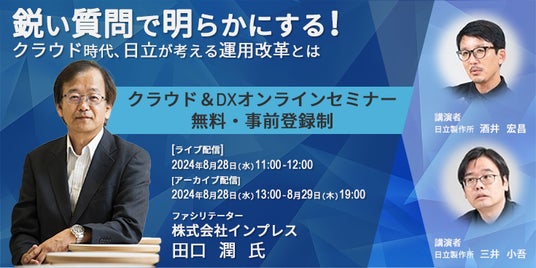 株式会社日立製作所(以下、日立)は、ITジャーナリストの田口潤氏をファシリテーターに迎え、「鋭い質問で明らかにする!クラウド時代、日立が考える運用改革とは」と題したオンラインセミナーを8月28日(水)に開催します。
