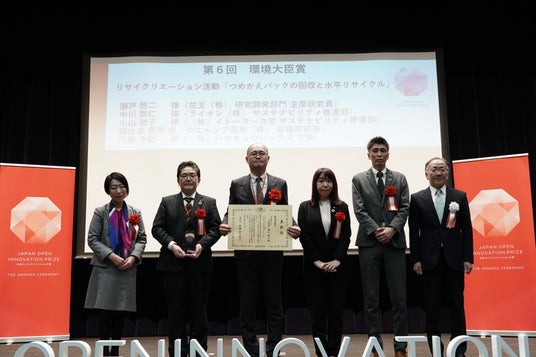 花王株式会社(社長・長谷部佳宏)は、このたび、ライオン株式会社、株式会社イトーヨーカ堂、ウエルシア薬局株式会社、株式会社ハマキョウレックスと共に、内閣府が主催する第6回日本オープンイノベーション大賞にて、「リサイクリエーション*1活動『つめかえパックの回収と水平リサイクル』」の取り組みが評価され、「環境大臣賞」を受賞しました。日本オープンイノベーション大賞は、社会インパクトが大きく、模範となり、持続可能性のあるオープンイノベーションを表彰する制度です。