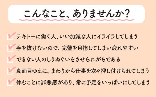 「人に仕事を任せられない」「完璧主義すぎて効率が悪い」「周りの人の仕事ぶりにイライラする」「人間関係でぶつかりやすい」「気を使いすぎて疲れてしまう」……など。