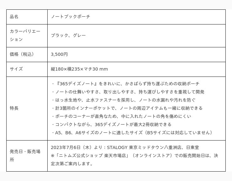 株式会社ニトムズ(本社:東京都品川区、代表取締役:中村 晃章)の「ありそうで、なかったもの」がコンセプトのステーショナリーブランド『STALOGY』は、ユーザーの多彩な毎日を記録できる『365デイズノート』を持ち運ぶのに適した収納ポーチ『ノートブックポーチ』を、2023年7月6日(木)※に発売します。本製品は、当社直営店3店舗のみで販売します。 ※一部店舗は7月10日(月)発売