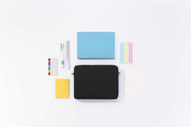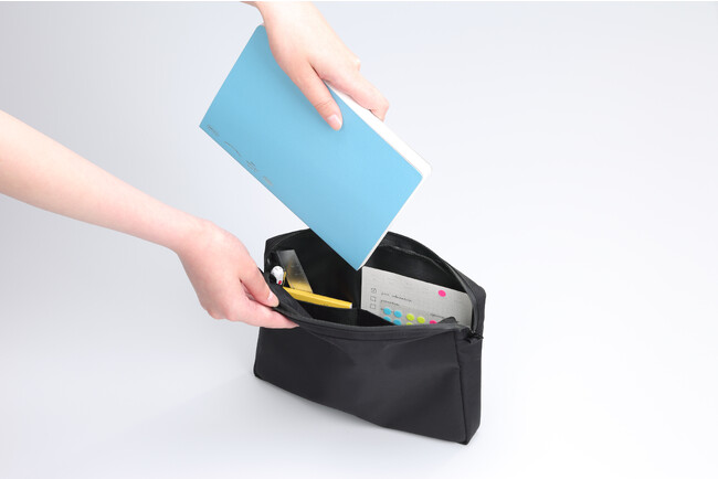 『ノートブックポーチ』はA5サイズまでのノートと共に、筆記具やふせん、シールなどのノート周辺小物を収納し、コンパクトに持ち運ぶためのポーチです。ノートをどこにでも気兼ねなく持ち出せるよう、ノートの仕舞いやすさ、取り出しやすさ、持ち運びしやすさにこだわっています。フリーアドレス制のオフィスやコワーキングスペースの登場、リモートワークの浸透などにより増加した、ノートやペンなどの小物類を持ち運ぶ機会に活躍します。