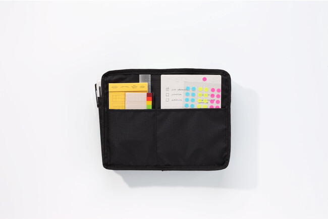 本ポーチは日記帳やスケジュール帳、クロッキー帳など、多様な使い方ができ、自分を見つめるツールとして大切に使われる方の多いSTALOGYの『365デイズノート』を、スマートに持ち運べるように開発しました。筆記具やふせん、シールなどのノート周辺アイテムも一緒に収納できるように、ポーチ内側にペンホルダーを含む計3箇所のポケットを備えています。ペンホルダーは他のポケットから独立しているので、ノートや他のアイテムを収納した状態でもスムーズにペンを出し入れできます。