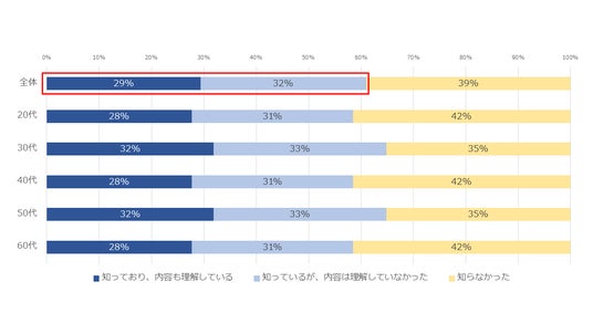 デジタル給与払いに関する認知度について聞いたところ、「知っており、内容も理解している」と答えた人が全体の29%、「知っているが、内容は理解していなかった」と答えた人が32%であった(図1)。また、年齢毎にデジタル給与の認知度を見てみると、各年代で認知度の大きな差は見られなかった。