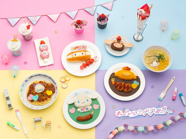 他にも毎回好評の「春のピューロランド学園祭スペシャルグリーティング」(有料・事前予約制)を実施する他、3階レインボーホールには、アーチと校門をイメージしたフォトスポットが登場します。レストランではコッペパンなど学生生活を思い出させるメニューや、旬のいちごを使った甘酸っぱいスイーツメニューを提供。ショップでもピューロ学園の校章が背中に描かれたパーカーやキーリングといったグッズを販売するなど、館内各所で学園祭気分を味わえます。