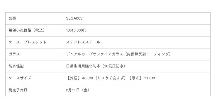 セイコーウオッチ株式会社(代表取締役社長:内藤 昭男、本社:東京都中央区)は、<グランドセイコー>より、スプリングドライブの最新ムーブメント「キャリバー9RA2」を搭載した初のレギュラーモデルを2月11日(金)より発売します。希望小売価格は1,045,000円(税込)です。