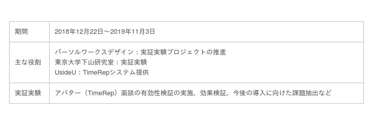 総合人材サービスのパーソルグループで、BPO、ヘルプデスク/コールセンターのアウトソーシングなどを手がけるパーソルワークスデザイン株式会社(代表取締役社長:平林 由義、本社:東京都豊島区、以下 パーソルワークスデザイン)は、東京大学大学院教育学研究科(研究科長:秋田 喜代美、東京都文京区、以下 東京大学)および株式会社UsideU(代表取締役社長:高岡 淳二、本社:東京都中央区、以下 UsideU)と共同で「TimeRep(タイムレップ)」を活用したアバター心理相談サービスの開発を開始します。
