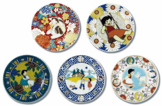 ・九谷焼 豆皿(各税込¥1,320・花詰ハイジとヨーゼフ柄・花模様ハイジのブランコ柄・吉田屋風ハイジとユキ柄・五彩アルプスの山柄・瓔珞紋ハイジとユキ柄)