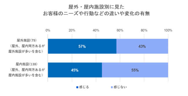 屋外施設と屋内施設とで変化の実感に違いがあるかを見てみると、屋外施設の方がよりお客様の新型コロナ対策に対する意識の変化を「感じる」割合が高い状況です。