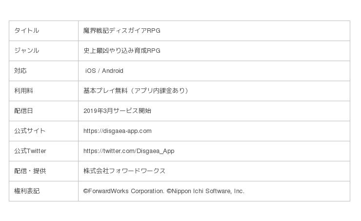 『魔界戦記ディスガイアRPG』は、シリーズの世界観や、やり込み要素を継承しながらも、「魔界戦記ディスガイア」シリーズの歴代キャラクターたちが登場するオリジナルストーリーや、いつでもどこでもサクサク遊べるコマンドバトルを採用するなど、スマートフォン向け完全オリジナルゲームならではの楽しさを実現いたします。