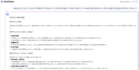 MyTokkyo.AiのChatTokkyo機能を活用し、先行技術調査や差別化ポイントを自動整理。従来2週間以上を要していた特許検討を約5日で完了。AIが音声・動作間の時系列相関を解析し、発明の技術的効果を定量的に可視化することで、出願ドラフトの品質が大幅に向上した。