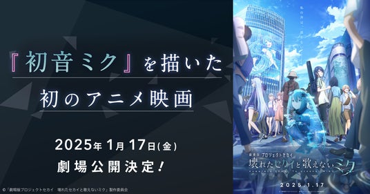 クリプトン・フューチャー・メディア株式会社(本社:北海道札幌市、代表取締役:伊藤博之、以下クリプトン)が展開するバーチャル・シンガー『初音ミク』を描いた初のアニメ映画『劇場版プロジェクトセカイ 壊れたセカイと歌えないミク』の劇場公開が決定いたしました。本作は、全世界ダウンロード数3,900万を突破した大人気アプリゲーム『プロジェクトセカイ カラフルステージ! feat. 初音ミク』(略称『プロセカ』)の初アニメ映画化作品で、2025年1月17日(金)より全国の映画館で公開予定です。2024年7月29日(月)付けでオープンした映画の公式WEBサイトおよび公式Xアカウントより発信される続報にご期待ください。