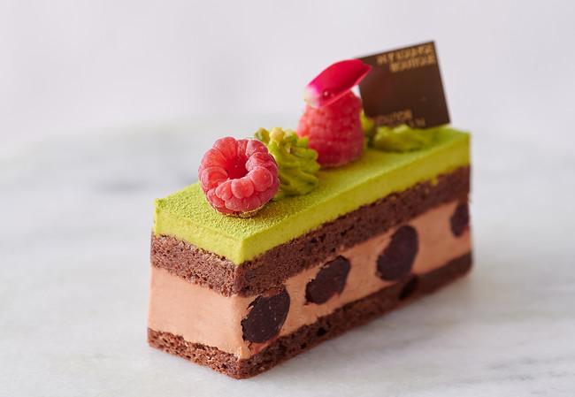 ほうじ茶とミルクチョコレートを合わせたムースに、ピスタチオのムースを合わせた贅沢な一品。