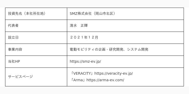 ちゅうぎんキャピタルパートナーズ(岡山市北区丸の内一丁目15番20号ちゅうぎん 本店ビル9階 代表取締役小橋 栄紀)は、スタートアップを出資対象とする「ちゅうぎん インフィニティファンド2号」より、SMZ株式会社(岡山市北区上中野 代表取締役 清水正輝、以下「SMZ社」)に対し、令和4年10月の出資に続いて、追加出資を実施したことをお知らせいたします。