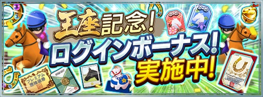 開催期間中15日間ログインすると「金の馬蹄石」、★1「オウザキネン」、「種付け権獲得手形」、「杜若色のお守り」、「受胎祈願の鈴」といった様々な報酬がもらえます。
