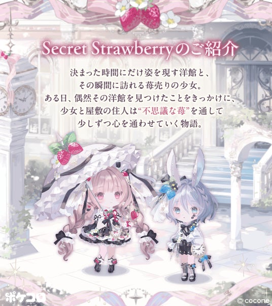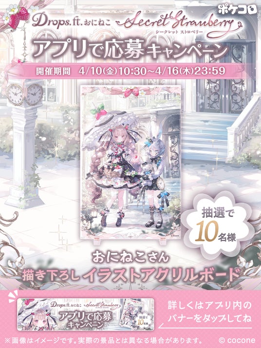 ココネ株式会社(本社:東京都世田谷区、代表取締役社長:石渡 真維、以下「ココネ」)は、ココネが運営開発するアバターアプリ『ポケコロ』において、水彩風の淡く繊細な色彩表現が魅力的で、展示会やVTuber関連など様々な分野で活動を広げているイラストレーター、おにねこさんが描き下ろしたイラストをアイテム化し、これを記念した特別イベント「Drops.ft.おにねこ Secret Strawberry」を本日より開催することをお知らせします。