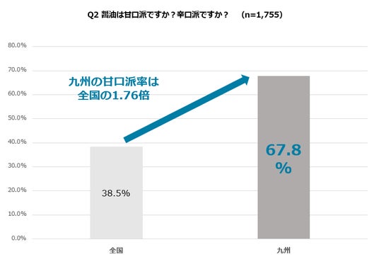 ◇醤油は「甘口派」「どちらかというと甘口派」と選んだ方は全国で38.5%だが、九州ではその割合が67.8%となり全国の約1.7倍となった。