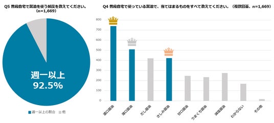 ◇Q5「普段自宅で醤油を使う頻度を教えてください」という設問で「週一以上(ほとんど毎日~週一以上)」を選択した方は全国で92.5%となり、かなり高い割合となりました。またQ4「普段自宅で使っている醤油」として選ばれたのは、1位「濃口醤油(741人)」、2位「薄口醤油(510人)」3位「さしみ醤油(423人)」となりました。
