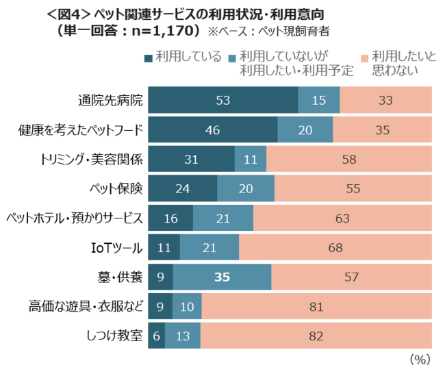 現在利用しているペット関連サービスは、「通院先病院」「健康を考えたペットフード」「トリミング・美容関連」「ペット保険(入院・通院・手術など)」で2~5割。現在は利用していないが利用したい・利用予定のものは、「墓・供養」が35%と最も高く、「ペットホテル・預かりサービス」「留守番見守りカメラ・自動餌やりなどのIoTツール」「ペット保険」が2割であった。<図4>