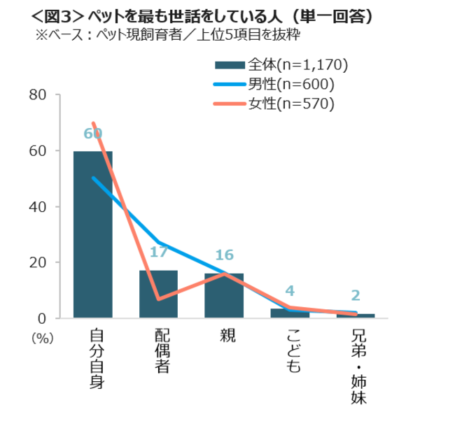 ペットを現在飼っている世帯において、最もペットの世話をみている飼育者は、「自分自身」が60%と最も多く、次いで「配偶者」の17%と「親」の16%。男性より女性の方が主に世話をしている。<図3>