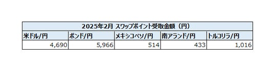 SBI FXトレード株式会社(本社:東京都港区、代表取締役社長:藤田 行生)は、2025年2月のスワップポイントの実績を公表しましたことをお知らせいたします。