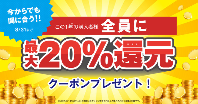 2021年8月1日~2022年8月31日の1年間で1円以上お買い上げいただいたお客様に最大20%還元クーポンをプレゼントいたします!