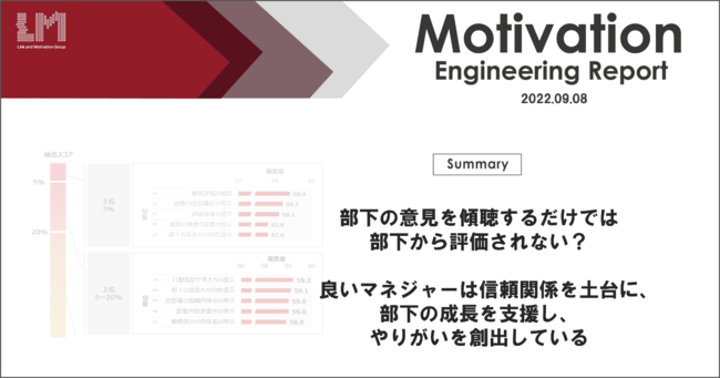 株式会社リンクアンドモチベーション(本社:東京都中央区、代表:小笹芳央、証券コード:2170、以下当社)の研究機関であるモチベーションエンジニアリング研究所(以下当研究所)は、「部下から評価されるマネジャーの特徴」に関する調査を行いましたので、結果を報告いたします。