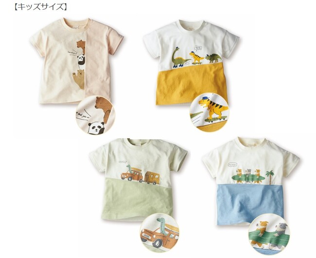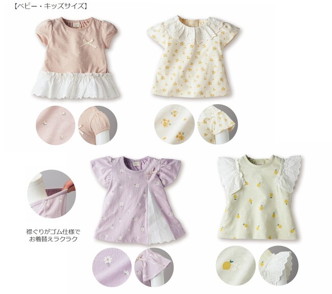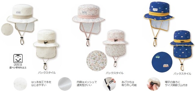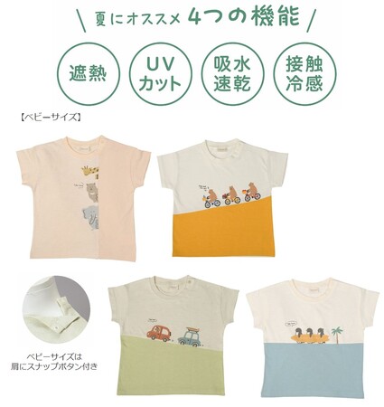 アニマルや乗り物のモチーフに切り替えの配色を活かした楽しいデザインと花柄にレースをあしらったかわいいデザイン。『遮熱・UVカット・吸水速乾・接触冷感』の4つの機能付きで、暑い夏の通園着にもおすすめの一着!