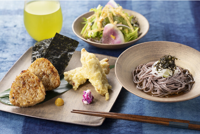 十穀味噌が香ばしい焼おにぎり、ビタミン・ミネラルを多く含むと言われている古代米の冷やし麺が一度に味わえる贅沢なセットです。和え物やサラダにも逸品を使用し、細部までこだわりました。