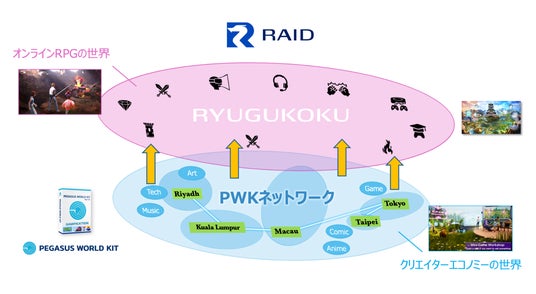 「RAID」とはRYUGUKOKU ADVENTURE IN DISCOVERYの略で、JP UNIVERSEが2025年に提供予定のアバターで遊べるオンラインRPGです。その技術基盤でもある独自ミドルウェア「PEGASUS WORLD KIT」の提供を通じて、アジア地域にクリエイターネットワークを構築しながら開発を進めています。