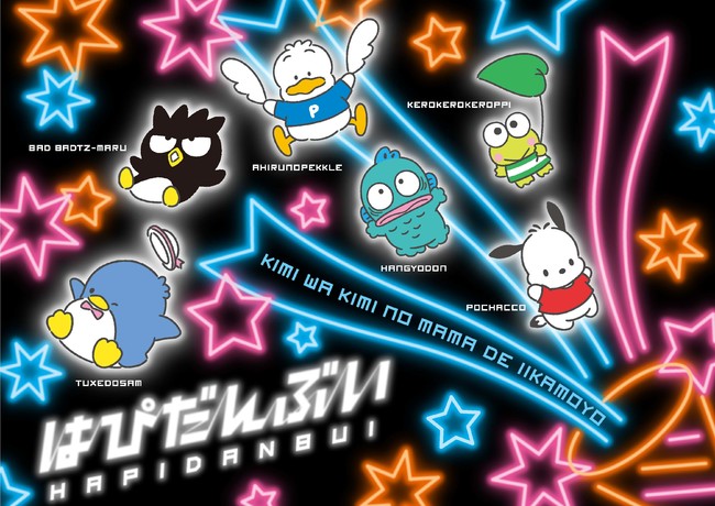 「ポチャッコ」、「タキシードサム」、「けろけろけろっぴ」、「バッドばつ丸」、「ハンギョドン」、「あひるのペックル」からなるサンリオの男のコキャラクターユニット。 「はぴだんぶい」というユニット名には、「ハッピーになりたい男子たち、V字回復をねらう」という意味が込められています。自分にスポットライトが当たらない時期も、自分らしさを大切にしてきたことで昨今人気を取り戻してきた彼らだからこそ言える“大丈夫!君は君のままで、きっとうまくいく。”というメッセージを発信し、色々なチャレンジを通じて「みんなをちょっとハッピーに」する活動を行っています。