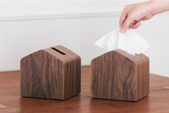 「大人気のMoiコンパクトティッシュケースの、よりインテリアに馴染む木目柄です。生活感の出ないデザインなので、見えるところに置いてもお洒落なところが気に入っています。」