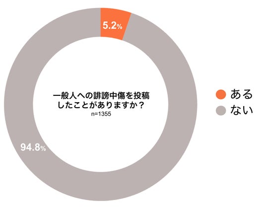 今回のアンケートでは、芸能人や有名人だけでなく、一般人(芸能人や有名人以外)に誹謗中傷したことがあるかどうかも質問しています。「ある」と回答した人が5.2%いました。