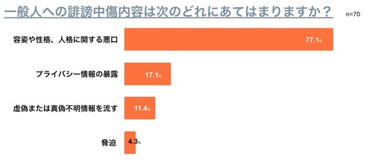 一般人に誹謗中傷をしたことが「ある」と答えた人のうち、「容姿や性格、人格に関する悪口」が77.1%、「プライバシー情報の暴露」が17.1%、「虚偽または真偽不明情報を流す」が11.4%、「脅迫」が4.3%となりました。