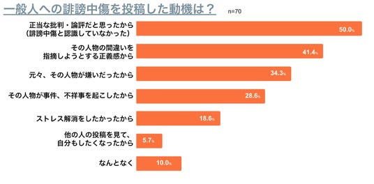 一般人への誹謗中傷の動機を尋ねたところ、「正当な批判・論評だと思ったから(誹謗中傷と認識していなかった)」が50%でもっとも多く、次いで「その人物の間違いを指摘しようとする正義感から」が41.4%となり、正義感から意図せず加害者になっている人が多い実態が明らかになりました。