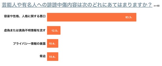 芸能人や有名人に誹謗中傷を投稿したことが「ある」と答えた人のうち、83.3%は「容姿や性格、人格に関する悪口」でした。「虚偽または真偽不明情報を流す」は12.5%、「プライバシー情報の暴露」と「脅迫」は10.4%でした。