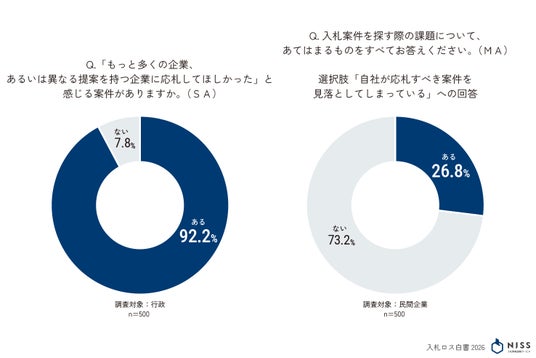 「見えない」優良案件:行政の92.2%が「もっと多くの企業に応札してほしい」と回答する一方で、4社に1社以上(26.8%)の企業が「自社が応札すべき案件を見落としている」と回答。