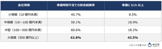 大企業の断念経験:売上500億円以上の大規模企業の63.8%が準備時間の不足により入札参加の断念経験があると回答。企業規模が大きくなるほどその数値は高くなる。