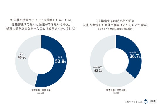 埋没するアイデア: 民間企業の53.8%が「仕様書通りでないと受注できないため、独自の工夫や提案を断念した」と回答。また準備時間の不足により応札を断念した案件の割合は「全体の40%以上」と回答した人は36.7%。