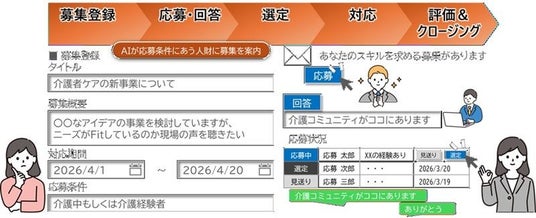 本サービスは、社員が登録した業務経験やスキル、資格を元に、副業を依頼したい部署が検索することで適切な社員を見つけられるものです。新機能では、部門が募集内容を登録すると、AIがマッチングを行い、関心や適性が高い社員に推薦します。また、募集内容は公開され、社員が自ら応募でき、部門は複数人からアイデアや意見を募集することもできます。これにより、AIが社員個人の得意分野や経験をもとに最適な案件とマッチングし、社員の活躍機会の拡大と自律的なキャリア形成を加速させます。さらに、企業は多様な視点やアイデアを得ることで価値創出につなげられます。