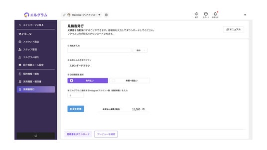 株式会社ミショナのInstagram自動化システム「エルグラム」は、見積書の発行が可能に。必要な情報を入力するだけで、社内稟議などに利用できる見積書を作成・ダウンロードできるようになりました。