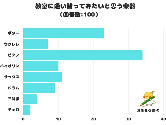 教室に通い習ってみたいと思う楽器をアンケートにて調査したところ、1位は「ピアノ」でした。