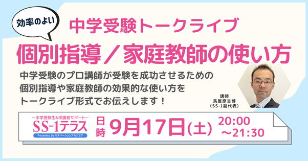 株式会社リンクアンドモチベーション(本社:東京都中央区、代表:小笹芳央、証券コード:2170)のグループ会社で、学習塾「中学受験専門個別指導教室 SS-1」(https://www.ss-1.net/)を運営する株式会社モチベーションアカデミア(本社:東京都中央区、代表:柿木秀雄)は、2022年9月17日(土) に中学受験を目指すお子さんを持つ保護者様向けトークライブ「効率のよい個別指導/家庭教師の使い方」を開催いたします。