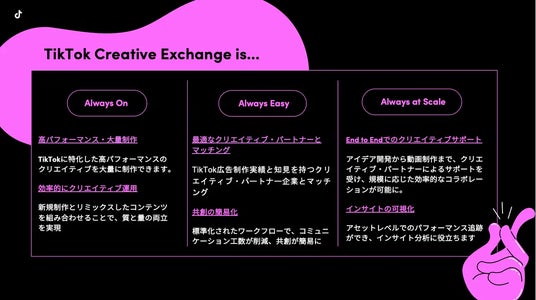 「TikTok Creative Exchange(TTCX)」は、迅速にスケールアップされた動画クリエイティブをワンストップで制作可能にするセルフサービス型のプラットフォームです。